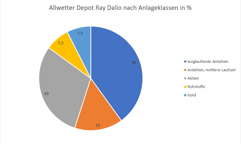 Nach Dalio ist folgende Kapitalverteilung unbedingt zu empfehlen: 30 Prozent in Aktien oder entsprechende ETFs, 40 Prozent in Anleihen mit mindestens 20 Jahren Laufzeit, 15 Prozent in Bonds von mittlerer Laufzeit und jeweils 7,5 Prozent in Gold und Rohstoffe, um eine stark steigende Inflation abfangen zu können. Immer am Jahresende müsste dann die Gewichtung angepasst werden, um antizyklisch zu handeln und Nachlaufeffekte zu vermeiden. So kann das Allwetter-Depot bestmöglich gestaltet werden.