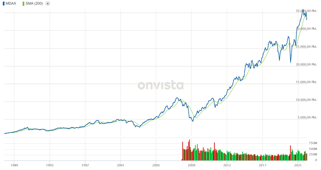 Man muss den MDax bei dieser Strategie genau beobachten. Krisen kann man vermeiden, indem man die 200-Tage-Linie nutzt – ein sehr einfaches Hilfsmittel. An dieser Linie orientiert man sich und kauft nach, wenn der MDax über den gleitenden Durchschnitt steigt. Fällt er unter diese Linie, sollte verkauft werden. Weshalb es genau 200 Tage sein sollten, ist einfach erklärt. Die Zahl ist nicht willkürlich gewählt – sie gilt in Rückrechnungen als bewährter Indikator.