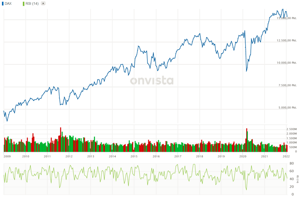 Sowohl der Beobachtungszeitraum, die Signalwerte als auch der Zeitpunkt des Kurses können jederzeit entsprechend dem Markt konfiguriert werden. Für den Dax als sehr volatilen und liquiden Markt wurde beispielsweise die Dax-RSI-Strategie entwickelt. Auch hier wird ein Beobachtungszeitraum von 14 Tagen gesetzt, in dem allerdings die Hoch-Kurse des Daxs herangezogen werden, da sie bessere Vorhersagen ermöglichen.